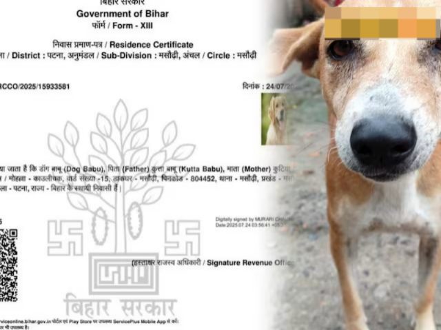 बिहार में SIR Abhiyan के तहत Document Checking जोरों पर है, मगर इसी बीच कुछ ऐसे मज़ेदार और हैरान कर देने वाले मामले भी सामने आए हैं जो चर्चा का विषय बन गए हैं। राजधानी Patna News के नजदीक Masaurhi Office क्षेत्र में एक ऐसा Masaurhi Residence Certificate जारी हुआ है, जिसे देखकर कोई भी हंस पड़े और फिर हैरान रह जाए। इस दस्तावेज़ में नाम दर्ज है ‘Dog Babu’, पिता का नाम ‘कुत्ता बाबू’ और माता का नाम ‘कुतिया बाबू’, साथ ही पते में कुत्ते की तस्वीर लगी है।